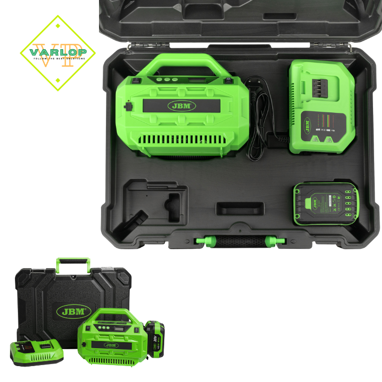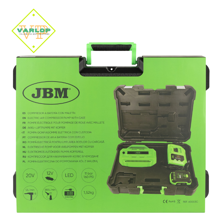 Está equipado com uma luz LED, um adaptador de ficha para isqueiro de 12V, um ecrã LCD digital e um interruptor de modo de trabalho para seleccionar entre dois modos de fluxo de ar, conforme necessário. A pressão do ar é ajustável e pode ser visível no ecrã de visualização em 3 unidades diferentes: PSI, BAR e KPa. Além disso, inclui uma mangueira de alta pressão com uma válvula universal, uma mangueira de alta capacidade, um adaptador de válvula, um adaptador de forma de cone, e uma agulha de sopro ou de insuflação.