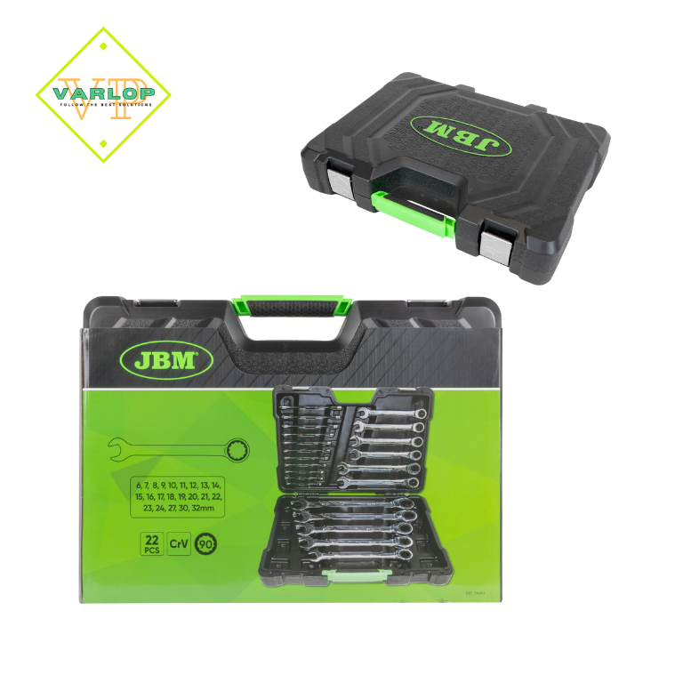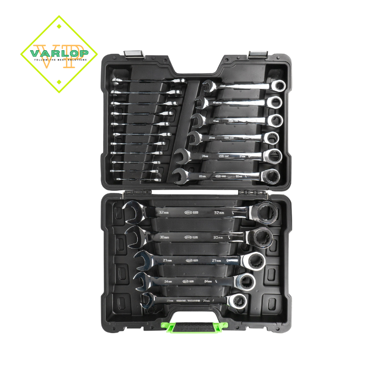 O conjunto inclui chaves nos seguintes tamanhos: 6, 7, 8, 9, 10, 11, 12, 13, 14, 15, 16, 17, 18, 19, 20, 21, 22, 23, 24, 27, 30 e 32 mm