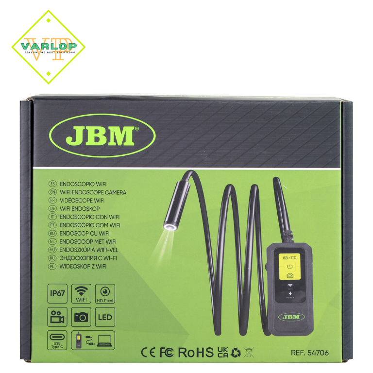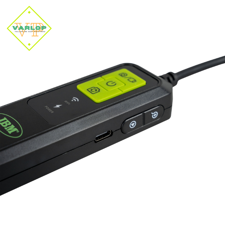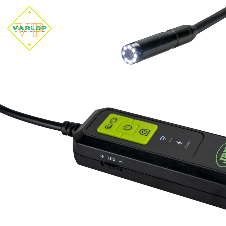 Endoscópio WiFi com câmera portátil de inspeção projetado para permitir que os usuários explorem áreas de difícil acesso. Ele se conecta sem fio a um dispositivo inteligente por meio de um aplicativo, facilitando a visualização, captura de fotos e gravação de vídeos.