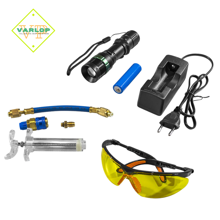 Conjunto especialmente concebido para detectar perdas de pressão de ar condicionado e sistemas de refrigeração com facilidade.