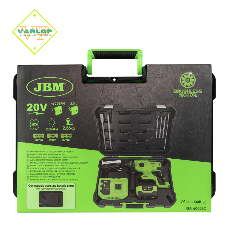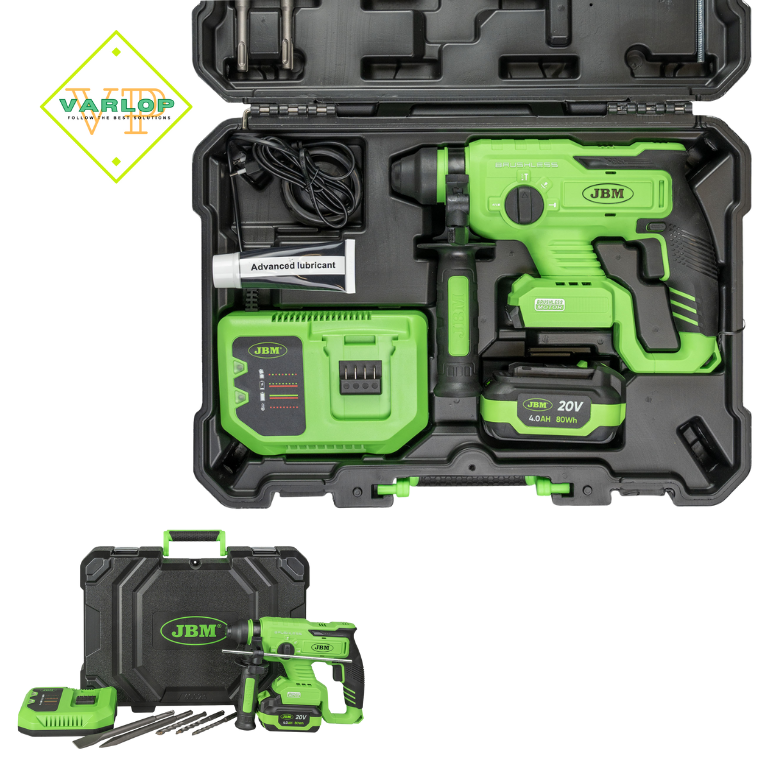 Este modelo foi concebido com o martelo rotativo elétrico sem escovas para executar tarefas de cinzelamento e perfuração com impacto em betão, tijolo e madeira, bem como tarefas noutros materiais, como aço, metal, cerâmica e plástico, onde é necessário efetuar perfurações sem impacto.